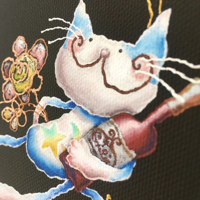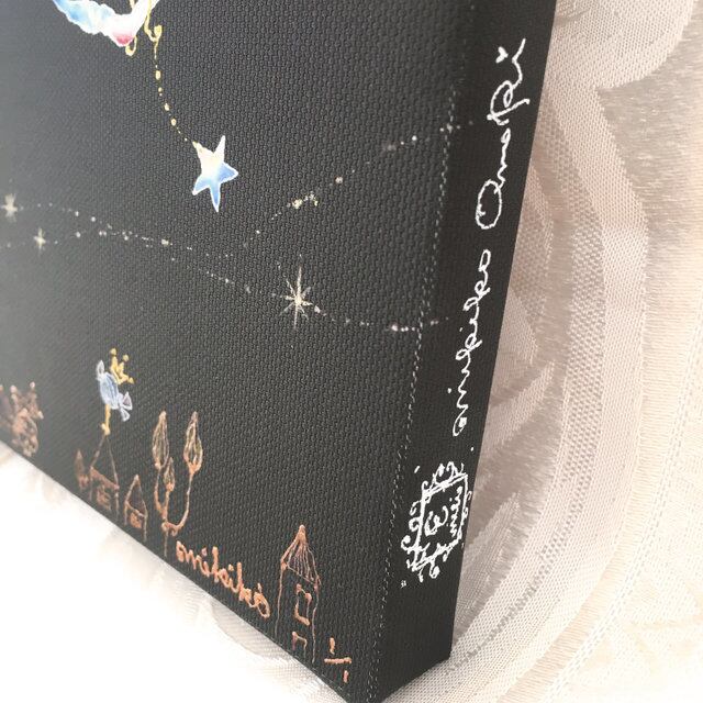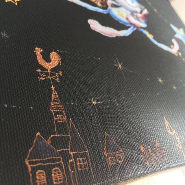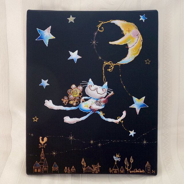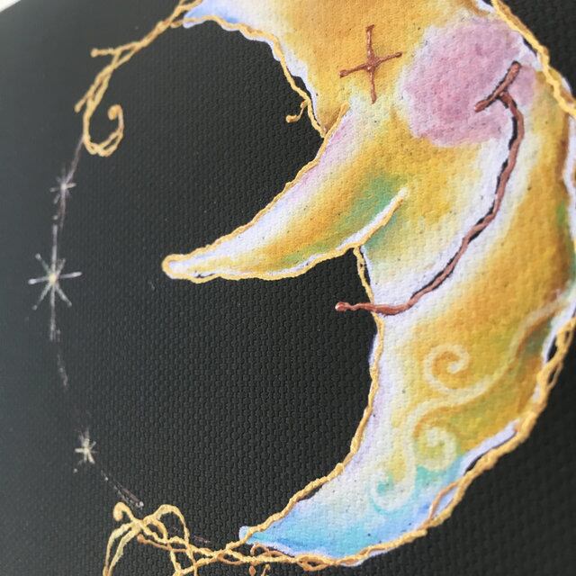 キャンバス地にジクレープリントを施した上に、一枚一枚に、手彩色を加え、手描きでゴールドのラインやお月さまの顔などを描き加えています。