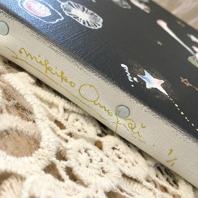 キャンバス地にプリントを施した上に、一枚一枚に、手彩色を加え、しぼり描きでゴールドなどのラインなど描き加えています。