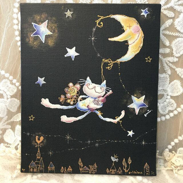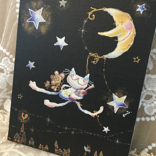 アートキャンバスパネル[F3サイズ:273×220mm]・『猫のエミリー☆お月さまのリフト』